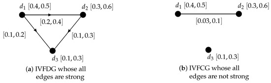 Let all the vertices of are independent strong. Let where be an IVFMCG of IVFDG . If be empty set then there does not exists any edge between c and d in . If be non-empty then obviously as all the edges of are independent strong and hence which implies that all the edges of are independent strong. □