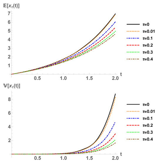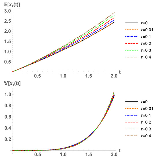 This is a test example, with arbitrary distributions, to show how (9) and (10) may be employed to compute the expectation and the variance of the stochastic solution. Theoretical results are also illustrated. Let and . Define and , where d and e are random variables with and . By using the chain rule theorem, Proposition 1, it is easy to prove that both g and f are in the -sense, . The random variables a, b, d and e are assumed to be independent. Consider the solution stochastic process defined by (2). It is an -solution for all , by Theorem 7. With expressions (9) and (10), we can compute and ; see Figure 1. The results agree with Monte Carlo simulation on (1). Observe that, as approaches 0, the solution stochastic process tends to the solution with no delay defined in Theorem 10, as predicted by Theorem 13.