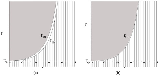 Schematic stability diagram of the Thomson vortex N-gon: (a) The case of odd ; (b) The case of even . Gray is the area of orbital stability in an exact nonlinear setting, the vertical shading is the area of instability, white color and neutral curves , are the area of linear stability, where is required nonlinear analysis. The diagram is true for and for if the conditions (33) and (34) are valid.