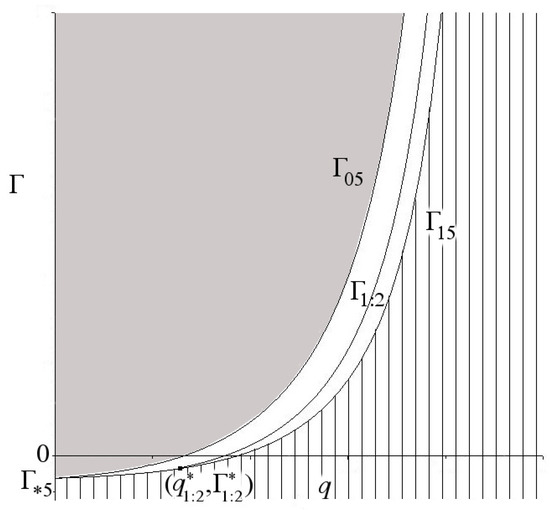 The results of the study of the linearization matrix and the quadratic part of the Hamiltonian are presented as stability diagrams in Figure 3 if the conditions (33) and (34) are valid. For and in some cases , we checked their execution numerically. For a nonlinear stability analysis has been performed in the critical case of two-fold zero on the corresponding resonant curve , . It is shown that the stationary rotation of the vortex triangle is unstable. For a vortex pentagon , a nonlinear analysis has been performed in the critical case of the resonance 1:2 on the curve , , shown schematically in Figure 6. Instability has been proved. The resonance curves and intersect in the point . There are no points of resonance 1:2 in domain and , although it requires nonlinear analysis.