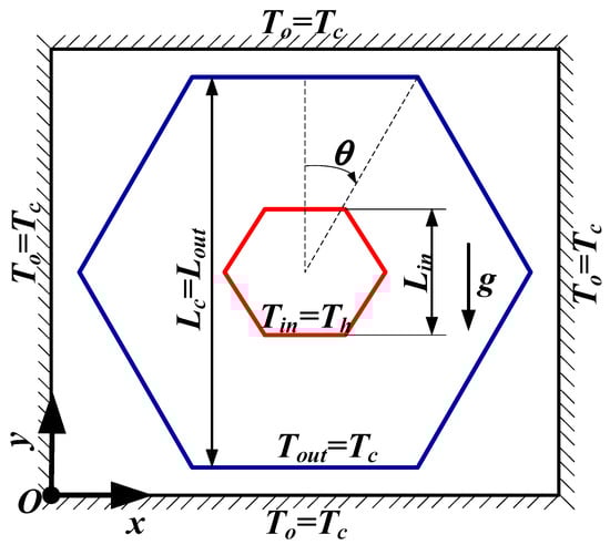 Figure 1 shows the simulation set-up, which consists of an annulus region formed by two concentric horizontal hexagonal cylinders of different sizes, considered in the present work. Simulations are performed inside a square enclosure and lattice grid points are used to divide the computational domain. The center positions of the two hexagonal cylinders are fixed at the center of the enclosure. in the figure represents the distance between two opposite sides of the outer hexagonal cylinder (the size of the outer cylinder). Throughout the simulations, is kept constant at and the size for the inner hexagonal cylinder, in Figure 1, is varied based on the aspect ratio, which is defined as: . in the figure denotes the gravitational acceleration constant.