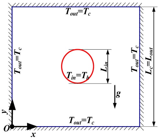 Natural convection heat transfer in an annular space between two concentric cylinders (also known as concentric annuli) is one of the most studied problems in the field of heat transfer. This fundamental problem has attracted many researchers because of its significance in many engineering applications such as the design of heat exchanger devices, solar energy collectors, cooling of electric power cables, nuclear and chemical reactors, food processing devices, aircraft cabin insulation, etc. [,]. For early research works of theoretical and/or experimental investigations on natural convection in an annular space between cold outer and hot inner cylinders, one can find the literature [,,,,,,,]. Studying the behavior of natural convection flow in an annulus with irregular geometries (other than the square or rectangular such as circular, elliptical, triangular, and hexagonal) by using the numerical simulations is highly challenging due to complex irregular boundaries. The irregular boundary problems are generally treated with unstructured (body-fitted) grid methods, also known as conforming-mesh methods, which are very complicated and are computationally intensive. In the past two decades, many researchers have paid attention to develop non-conforming-mesh methods, which use a fixed Cartesian grid to simulate the fluid flow in complex geometries. Some of those numerical methods are immersed boundary method (IBM) [], distributed Lagrange multiplier method or fictitious domain method [], and smoothed profile method (SPM) [,,].