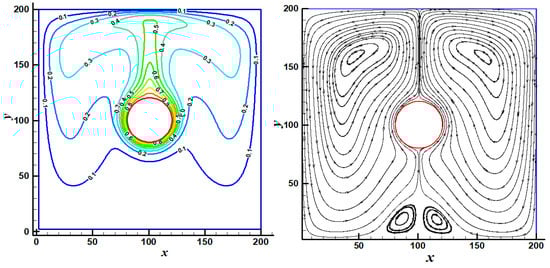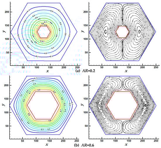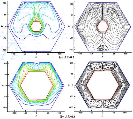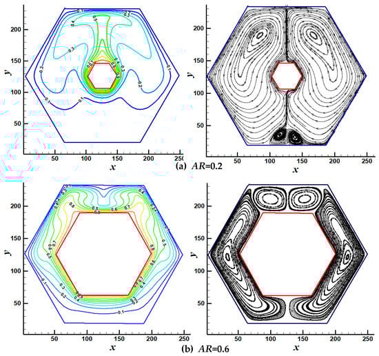 It is observed from the simulation results that irrespective of AR and Ra values, the fluid flow patterns (streamlines) and temperature contours (isotherms) are symmetrical about the vertical centerline of the annulus. Figure 4 shows the isotherms (left side) and streamlines (right side) pattern inside the annulus for the two values of AR = 0.2 (Figure 4a) and AR = 0.6 (Figure 4b), when . As Ra is very low, the strength of the buoyancy force (strength of the gravitational acceleration in this case) that causes the convective flow is very low. Therefore, the heat transfer process inside the annulus is mainly dominated by the conduction mode and the isotherms are very smooth (no distortion of isotherms takes place due to very weak fluid flow) and are almost concentric to the inner and outer hexagonal cylinders. Both isothermal and streamlines are symmetrical concerning the vertical as well as horizontal centerlines of the annulus. When AR = 0.2, the isotherms are almost circular and the spacing between them increases with the distance from the inner hexagon as the available space between inner and outer hexagons is more than that when AR = 0.6. On the other hand, when AR = 0.6, the isotherms in the vicinity of both inner and outer cylinders are in the form of the hexagon and the spacing between them is less as they get squeezed due to constricted space between inner and outer hexagons. The streamlines pattern for both AR = 0.2 and AR = 0.6 show that two symmetrical recirculating eddies (kidney-shaped cells) are formed inside the annulus and the location of cell centers is almost close to the horizontal centerline of the annulus as the fluid flow intensity in the upward direction is almost negligible because of very low Ra. When we observe Figure 4b carefully, we can see that there is slight penetration of the streamline into the solid edges, which is a slight drawback of the present scheme. The main reason for this phenomenon is that as SPM is a non-conforming-mesh method, the same grid system is used for the solid and fluid regions and simulations are also performed inside the solid regions (even though it is enough to consider the boundary effects on the hexagonal edges). However, performing the simulations inside the solid does not affect the flow field in the fluid domain and the overall behavior of the fluid flow and heat transfer is well captured.