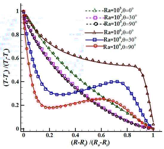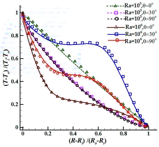 Figure 7 shows the temperature distribution along the gap between the inner and outer hexagonal cylinders at three different angular directions, (along the line passing through the vertical median), (along the line passing through the right uppermost corners of the two hexagons), and at (along the line passing through the horizontal median) when AR = 0.2. and in the figure denote the radius of circles that pass through the edges of inner and outer hexagonal cylinders, respectively. The temperature distribution profiles are plotted for two Rayleigh numbers: and . The symbols in the figure indicate the corresponding results obtained from the Fluent, which are in good agreement with the present simulation results. When , the temperature profiles, along all three directions, show a quasi-linear pattern (in other words, the temperature gradients along the gap are almost constant) with the gap as the conduction is the primary mode of the heat transfer process in the annulus. The temperature profiles along and are almost the same as the isothermal lines are almost concentric and values at and are the same. When , as the strong convective fluid flow disturbs the uniform temperature distribution over the inner hexagon, high-temperature gradients are observed near the inner and outer hexagonal cylinder edges. As mentioned earlier, a thermal plume is formed in the direction of for AR = 0.2, the temperature gradients closer to the outer cylinder wall are very steep for the temperature profile along as the thermal boundary layer thickness is very thin due to continuous impingement thermal plume against the top flat edge of the outer hexagonal cylinder. The slope of the temperature profile near the outer cylinder wall is steeper for compared to that for as the convective fluid flow intensity is weaker at .