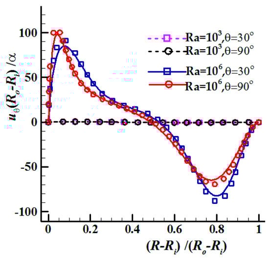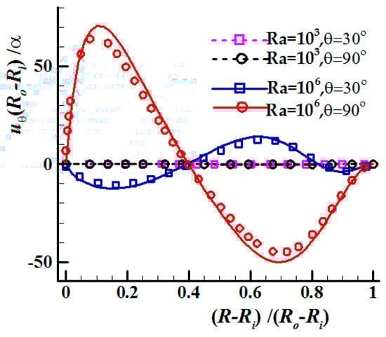 The profiles for the tangential velocity distributions when AR = 0.6 are provided in Figure 10 for Rayleigh numbers, and . In this case, as well the magnitudes of when are very small compared to those when . When AR = 0.6, as the thermal plume is formed along the direction, the tangential velocity in that direction is very low (fluid flow radially outwards along ). Therefore, the magnitude of along very low compared to that along . The locations for the flow reversal points of the two velocity profiles along and are the same and are located away from the gap center and are towards the inner cylinder. The magnitudes of obtained for AR = 0.6 case are lower compared to those obtained for AR = 0.2 ( data of Figure 9) as available space for convection flow is constricted at AR = 0.6. The tangential velocity profiles data obtained from the present simulation technique, for cases of AR = 0.2 and AR = 0.6, and and , are compared with those of Fluent software (the symbols in Figure 9 and Figure 10). The present simulation results show good agreement with the Fluent data.