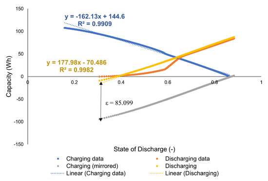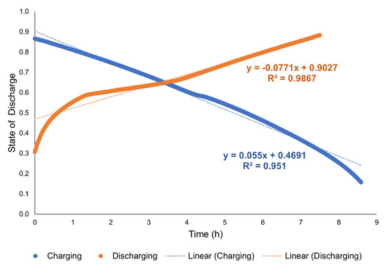 The data used to obtain the parameters for the linear models of the NaS batteries for charge and discharge cycles are shown in Figure 4 and Figure 5.
