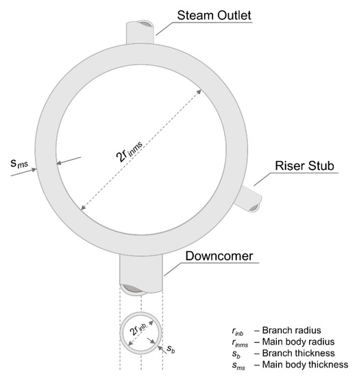 Additionally, two post-optimization analyses are carried out: one considering the stress of the most stressed part of the drum and the other on the CO2 equivalent assessment. The post-optimization analysis of the most stressed part of the drum is performed by using Equations (29)–(36) along with Equation (19) after the optimal dispatch is determined. Equations (29) and (30) are developed by modifying Equations (21) and (22) using the stress concentration factors due to the shell–branch connections (e.g., drum–downcomer junction). A diagram of the steam drum is shown in Figure 6.