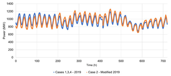 Case 2 considers a minor modification to the 2019 demand by increasing the minimum and maximum loads, i.e., the valleys and peaks, which would require faster ramping abilities from the grid. The electricity price and solar/wind penetrations into the grid are considered to be the same as in Case 1. The rationale in Case 2 is to verify the grid’s capability to supply the demand under a more challenging demand peak/valley scenario. In this case, the results depicted in Figure 10 show that the load demand is supplied mainly by the SCPC and NGCC, while the NaS batteries are used only twice (as highlighted in Figure 10) to smooth the peak at the approximate time of 450 h and to smooth the valley at the approximate time of 580 h. Specifically, at approximately 580 h, the sum of energy provided by the SCPC, NGCC, and renewables (green dashed line) surpasses the total load demand (shaded area). The reason is that there is an excess of electricity in the grid, which is used to recharge the batteries (orange line matches with shaded area). Due to the battery operating costs, they are used sparingly to prevent infeasibility. The detected behavior indicates that in case an unexpected demand was to happen, that would lead to suboptimal dispatch, and the batteries could be used more often for frequency regulation to satisfy the demand. As a perfect demand forecast of 6 min is assumed by the dispatcher, it is considered that any sudden deviation that was to happen could be supplied by spinning reserves. The results obtained in Case 2 are in accordance with the literature, in which the batteries are often employed in the absence of transmission structure or isolated areas where energy sources are scarce [13].