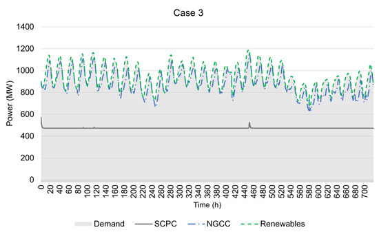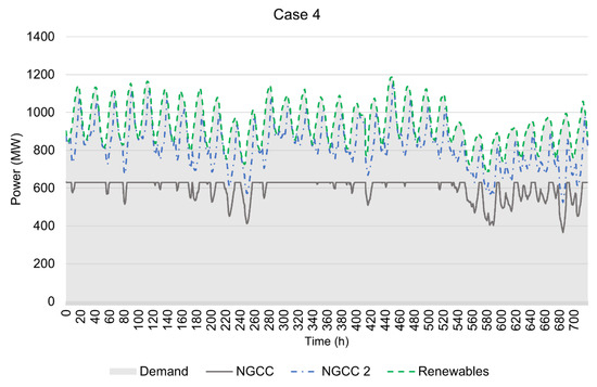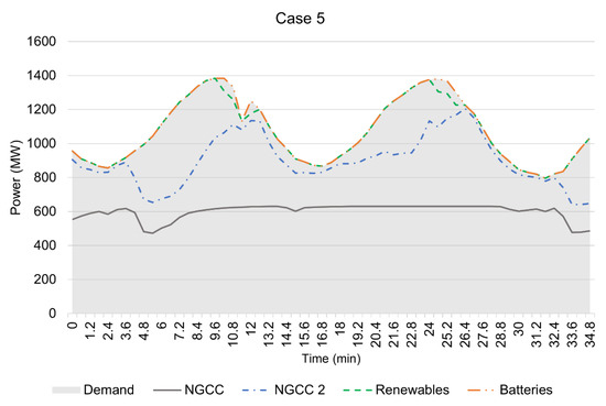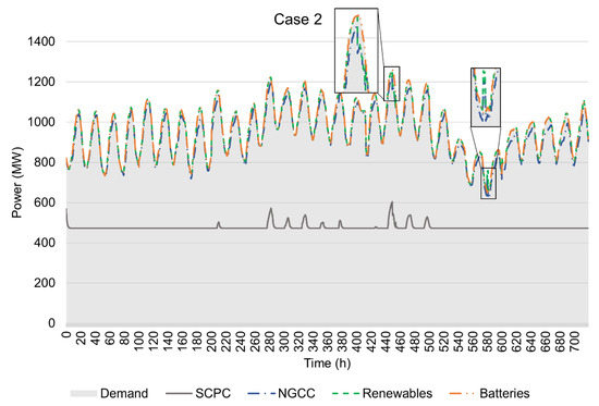 Figure 9, Figure 10, Figure 11, Figure 12 and Figure 13 show the results as stacked plots for the four case studies, i.e., the plot is shown as cumulative in the order of appearance of each technology (SCPC, NGCC, NGCC 2, NaS batteries, and renewables). For instance, if at some time instance a second line superimposes the first line, the energy system of the second line is not providing energy at that instance. The amount of energy being provided by a specific energy system is the subtraction between the previous and current energy system. This type of plot is chosen to rapidly verify if the power of the grid is balanced. If the line that represents the last energy source to be added matches the contour of the gray shaded area (demand), that means the power is balanced.
