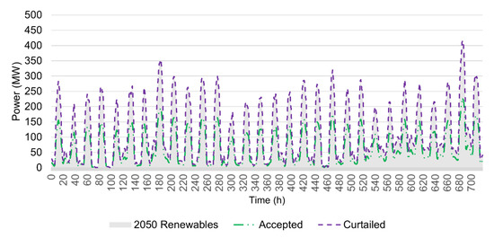 In Case 3, the electricity price, grid components, and demand are held constant and equal to those in Case 1, while the solar/wind penetrations are switched from 2019 to 2050 values. The 2050 wind/solar penetrations are shown in Figure 8. The 2050 intermittent renewable energy penetration is based on the 2019 penetration and Table 1 proportionality factors. The main goal of simulating Case 3 is to verify the potential of the 2019 grid components to supply the demand considering the high penetration of wind/solar sources. The results for Case 3 depicted in Figure 11 show that the load demand is supplied by the SCPC and NGCC components. However, to avoid infeasibility during dispatch, a 45% maximum curtailment is allowed. Figure 12 shows the curves for the accepted and curtailed renewable levels in Case 3. Under these circumstances, the batteries are not enough to avoid curtailment. To lower levels of curtailment, the optimizer stopped mostly after utilizing the energy available in the battery. This result indicates that considering the 2050 renewables penetration projection, the current grid is not sufficiently flexible to prevent curtailment. The reasons may be because the power plants are not capable to ramp up/down fast enough, the minimum load of the power plant is too high, and the batteries do not have enough capacity available to manage the variability introduced by the renewables.