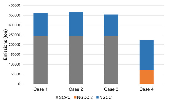 In Figure 14, note that most of the CO2 emissions derive from the SCPC power plant, as the NGCC has a lower rate of CO2 emissions per generated unit of power. In particular, even though Case 3 has the 2050 renewable power generation, the amount of CO2 emissions is similar to that in Cases 1 and 2, as renewables curtailment was allowed. This result implies that increasing the renewable production should be done along with increasing grid flexibility; otherwise, the environmental performance may not improve as expected. A possibility to lower the emissions would be to combine the SCPC with a carbon capture technology. The carbon capture unit would have an energy penalty for the SCPC [20,22], but it could substantially decrease the CO2 emissions. In addition, a multi-objective optimization considering economic and environmental objectives could also be applied to target emission reduction while determining the optimal dispatch.