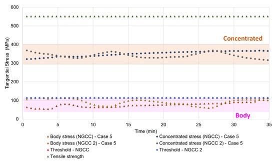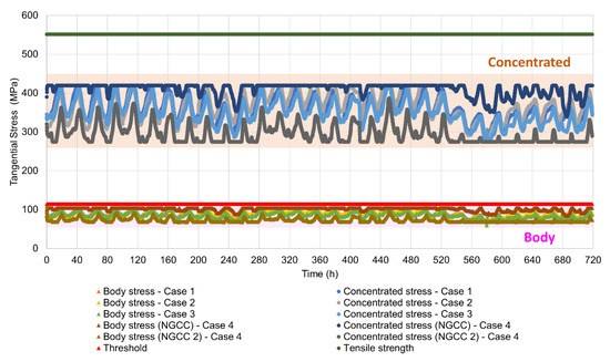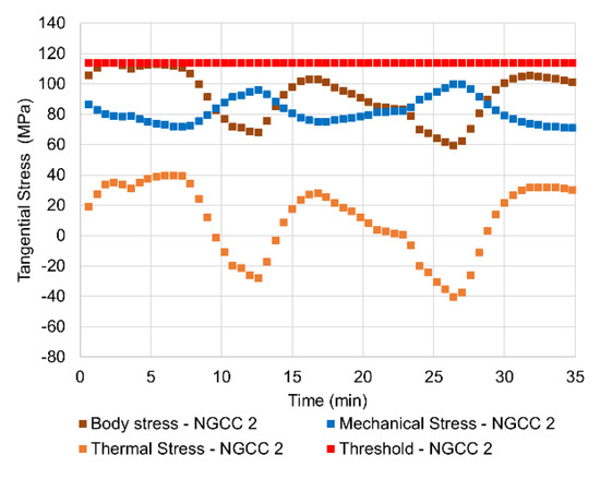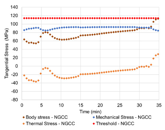 The calculated MAS value is about , which is more conservative than the threshold considered in a similar work [7]. The MAS value is used to determine the maximum tangential stress value during dispatch according to Equations (23) and (24):