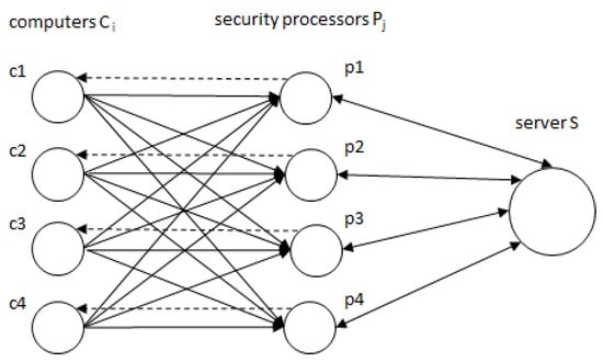 Consider a data transfer system consisting of n computers and one server S. The computed data from computer , are sent to S whereby the corrected data have to return to . We assume that the connection between and S is only possible via one of n security processors , the connections between and are one-way connections, and the capacity of the connection between and is equal to . Moreover, suppose that security processors are connected with S by two-way connections with capacities in both directions. The data are transmitted in data packets, and every data packet is transmitted over just one connection as an inseparable unit. Therefore, the total capacity of the connection between i and S is equal to , that is, different used connections are comprised as the maximum of capacities (not as their sum).