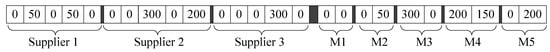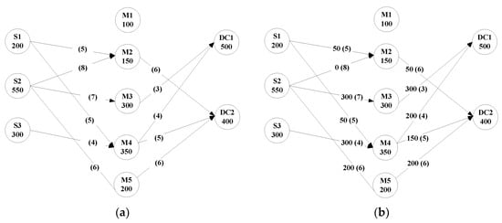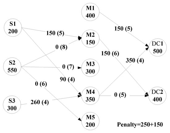 Renew the corresponding supply capability and demand. The remaining supply capability of manufacturer 3 is 300 − 300 = 0 and the renewed demand of distribution center 1 is 500 − 300 = 200.