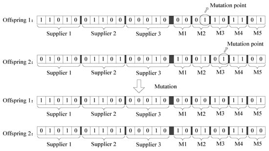 Due to the special feature of this two-stage encoding, the search of the proposed method is more easily trapped in a local optimum. Mutation process can prevent this situation. Therefore, one-point mutation is implemented, in which the mutation rate is set to 1. The process of mutation contains three steps as shown in