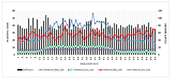 This section discusses the results of the initial experiments conducted to demonstrate the developed dynamic staff allocation and to ensure the reliability of the results. Since there are four types of staff—airline, security, immigration, and quarantine—the simulation was run with various staffing levels for each process to ensure that we investigated the operation of the terminal for all possible scenarios, as shown in Table 1. The results were collected from 81 multi-simulation runs for the two types of allocation method: (1) allocating staff according to a static base and (2) allocating staff dynamically—staff allocated when needed. For each simulation run, the Key Performance Indicators (KPIs) considered in this study were recorded for each processing point, both outbound and inbound. The KPIs included the maximum/average queue length, the maximum/average waiting time, the number of late flights/average time delay for late flights, and the total staff hours.