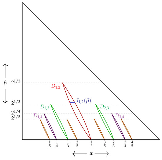 see Figure 1 for a sketch of the intervals . If , then is a single point and, if , then is an interval of positive Lebesgue measure. Further, for a fixed , in [22], it was shown that the Lebesgue measure of