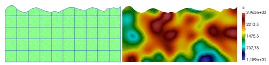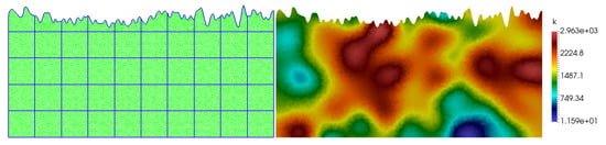 Computational grids and heterogeneous properties for Tests 2.DBC, 2.NBC, 2.RBC (two-dimensional problem). Left: Coarse grid (blue color) and fine grid (green color). Right: Heterogeneous coefficient .