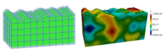 Computational grids and heterogeneous properties for Tests 3.DBC, 3.NBC, 3.RBC (three-dimensional problem). Left: Coarse grid (blue color) and fine grid (green color). Right: Heterogeneous coefficient .