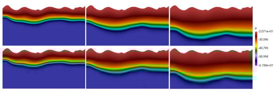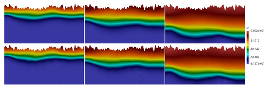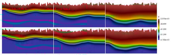 Numerical results for Test 1.RBC. Solutions p and for different times: , , and (from left to right). First row: Fine-scale solution . Second row: Multiscale solution using 16 basis functions .