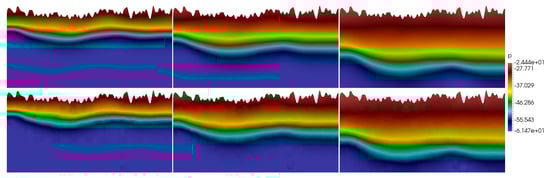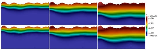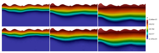 Numerical results for Test 2.NBC. Solutions p and for different times: , , and (from left to right). First row: Fine-scale solution . Second row: Multiscale solution using 16 basis functions .