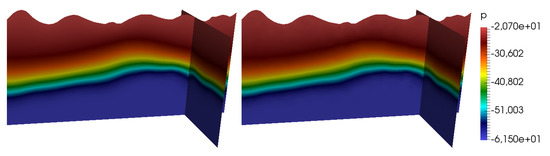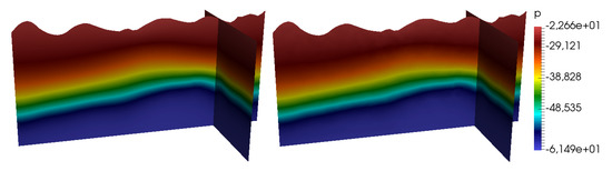 Numerical results for Test 3.RBC. Solutions p and for the final time. Left: Fine-scale solution = 43,524. Right: Multiscale solution using 32 basis functions = 12,738.