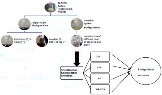 In the present study, our major aim was to design a novel methodology to estimate and predict the simultaneous biodegradation of azo dyes and chromium (VI) in a single and combine system by means of machine learning programing. The acquired data were subjected to use in training GEP, RF, SVR, and SVR-FOA procedures. The gene expression program was up-to-date algorithm methodology that described the relationship between given input and resulting output variables through software development [].