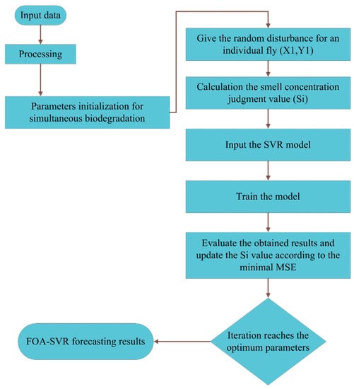 The FOA is a biological program inspired by the behavior of Drosophila insect for food search (Pan, 2012). The Drosophila insect has a unique quality of superior smell and vision, which differentiate and make it superior from other insects. The insect employs a sense of vision when approaching a food source. This information is transmitted to the insect body, which determines the route leading to the food source identified []. The schematic diagram of SVR-FOA methodology, adapted by Nabipour et al. [], is shown in Figure 2.