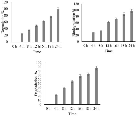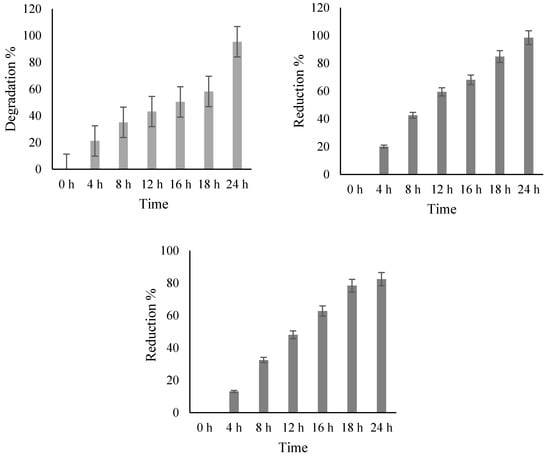 Regarding simultaneous degradation results (azo dyes at 100 mg L−1 and Cr at 5 mg L−1 concentration), 89% degradation was observed after 24 h of inoculation of bacterial strains Klebsiella sp. KOD36 after 24 h, as compared to control (Figure 5). While for 100 mg L−1 (azo dyes and 10 mg L−1 Cr), up to 94% simultaneous degradation was observed after 24 h of inoculation of bacterial strains Klebsiella sp. KOD36, as compared to control. The percent degradation for 150 mg L−1 azo dyes and 5 mg L−1 Cr, and 150 mg L−1 azo dyes and 10 mg L−1 Cr were 91% and 82%, respectively, after 24 h, as compared to control. Similar effects could also be observed in the study conducted by Halmi et al. [], who isolated a novel potential stain for decolorization of four different dyes, namely amaranth dye, Biebrich scarlet, direct blue, and metanil yellow, under aerobic environment. The isolate bacterial strain exhibited decolorization a maximum of 52% of dyes (initial concentration 150 ppm potassium dichromate) in nutrient broth medium after an incubation of 24 h under shaking at 150 rpm. The enhanced biodecolorization effect could be likely have been due to the fact that biosurfactants reduce the toxicity of hexavalent chromium by entrapping it in micelles and reduce their bioavailability to microorganisms and, meanwhile, bacterial decolorization for azo dyes was enhanced.
