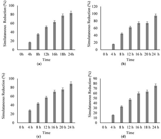 Time course study of simultaneous reduction (%) of azo dyes and chromium at concentration (a) (100 mg L−1, 5 mg L−1), (b) (100 mg L−1, 10 mg L−1), (c) (150 mg L−1, 5 mg L−1), (d) (150 mg L−1, 10 mg L−1) by Klebsiella sp. KOD36.