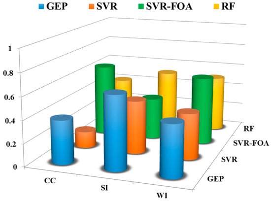 The SBAHC predictive results of various models is also shown in Figure 7. It can be observed from Figure 5 that SVR-FOA had a higher performance than other considered models. Furthermore, Figure 8 indicates scatter plots of prediction of the SBAHC values with SVR-FOA, SVR, GEP, and RF models. The less-scattered points exhibited by SVR-FOA is a clear indication that the values of SVR-FOA were more accurate than standalone SVR, GEP, and RF models.