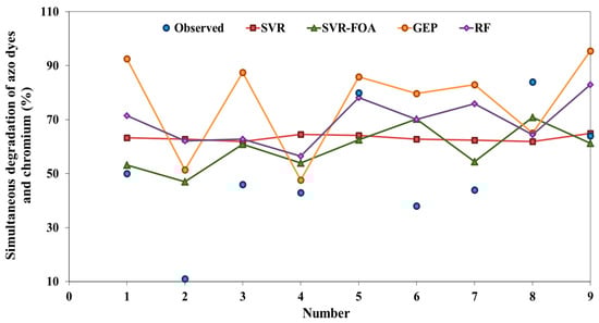 The estimated and observed values for simultaneous degradation of azo dyes and chromium (%) by various models used in the present study.