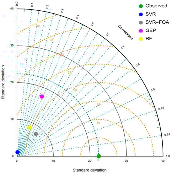 Furthermore, Taylor diagrams (TD) were employed to examine standard deviation (SD) and CC values for the SVR-FOA, SVR, GEP, and RF models. Figure 9 presents TD for all models. It can be understood from Figure 7 that SVR-FOA (a point with grey color), due to a shorter distance from the observed green point, provided relatively precise predictions of SBAHC values. As a conclusive remark, it can be stated that SVR-FOA with optimized values (C = 1.7242, γ= 0.0517m andε = 0.0468) and using input parameters of temperature, pH, incubation period (IP), and shaking is more capable for accurate estimation of SBAHC in comparison to standalone SVR and GEP models, and may be recommended for further implementations [,,].