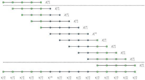 Cross-validation often requires the omission of more than one single data point and our five-year scenario is one such example. It can also happen that additional corrections are necessary when the omitted fraction of data is considerable [18]. In addition, De Brabanter et al. [14] show that automatic tuning parameter selection methods, such as cross-validation or plug-in, can fail when serial correlation arises (as in our longer-horizon application) and the structure of the error terms is ignored. Here, the problem is that for increasing correlations the chosen bandwidths become smaller, and the corresponding model fits become progressively more under-smoothed [19]. This reduces the bias of the predictor which contributes in a squared fashion to the prediction mean squared error—the numerator of the ratio in Equations (15) and (16). Consequently, the also increases—not for the better fit but due to the ignored correlation structure. The consequence is a misleading decision on the bandwidth or model specification (the set of preferred covariates). To avoid such problems, Chu and Marron [20] propose the use of bimodal kernel functions which are known to remove the correlation structure very effectively. Nevertheless, the estimator suffers from increased mean squared error [14]. To overcome the problems mentioned, De Brabanter et al. [14] propose a correlation-corrected cross-validation which consists of two steps: (i) finding the amount of data k to be left out in the estimation process when a bimodal kernel function is used; and (ii) applying the actual choice of the smoothing parameter using leave-k-out cross-validation with a unimodal kernel function. As we know k in our set-up by construction, we can skip the first step. For example, remember that in the five-year case. Now we have to exclude all that include any of . It is easy to see from Figure 1 that this amounts to a leave-nine-out set of .