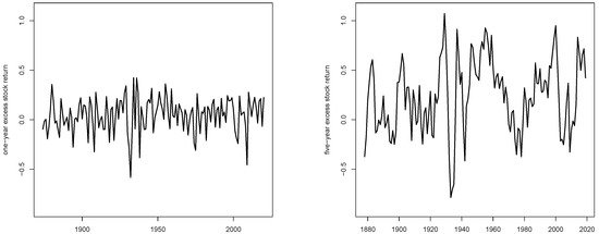 (Left) one-year stock returns in excess of the risk-free benchmark. (Right) five-year stock returns in excess of the risk-free benchmark. Period: 1872–2019. Data: annual S&P 500.