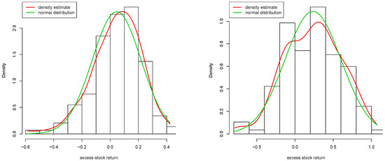 Figure 3 shows histograms of the one-year returns (left) and five-year returns (right) together with a kernel density estimate (red) and a fitted normal distribution (green). One notes again that the distribution of the five-year returns is shifted to the right but has a higher volatility. A Jarque–Bera test of the hypothesis of normality does reject for one-year returns (p-value ) but does not reject for five-year returns (p-value ). Furthermore, the density estimate for the five-year returns indicates more a mixture of normals than a single normal distribution which represents some evidence of a possible structural break in the data-generating process.