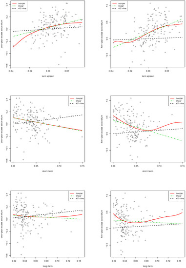 In light of these remarks, we therefore, focused the spotlight on the relationship between the spread and the excess stock returns. We present in the top panel of Figure 4 the estimated functions (red solid line) for the one-year horizon (left) and the five-year horizon (right) under the single risk-free benchmark together with a corresponding linear model (dash-dotted green line), and a 45-degree line (dashed black line). Figure 4 shows thereby the three single covariates with the largest ( and ): the term spread (9.7% and 15.5%), the short-term interest rate (3.0% and 7.8%), and the long-term interest rate (0.0% and 1.4%). Our findings for both horizons conformed to the fact that an increase in the spread corresponds to an increase in the excess stock return. While a positive spread corresponds to a positive return for the one-year case, a spread larger than gave, on average, a positive five-year return. This finding is in line with, for example, Resnick and Shoesmith [27] who find that the value of the yield spread holds important information about the probability of a bear stock market. Regarding our validation procedure, Figure 4 also confirms that our approach of correcting for autocorrelation in the five-year prediction problem was successful. The estimated functions are quite smooth indicating that the chosen bandwidth is not too small and that the resulting fit and validated are reasonable.