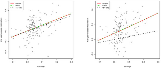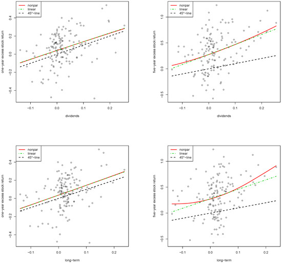 The top panel of Figure 5 shows the estimated nonparametric function (red solid line) for the one-year horizon (left) and five-year horizon (right) under the double inflation benchmark for the earnings-by-price covariate together with the corresponding linear model (dash-dotted green line), and a 45-degree line (dashed black line). Note that the linear relationship discovered for the earnings-by-price predictor must not hold true for other covariates or their combinations. In those cases, the full benefit of our approach comes into its own. For example, the bottom panel of Figure 5 clearly shows nonlinearities for the five-year case when the long-term interest rate is considered. For a suitable statistical smoothing-based test (nonparametric versus linear model), see, for example, the test based on wild bootstrap proposed in Scholz et al. [8] or the discussion in the survey of González-Manteiga and Crujeiras [31].