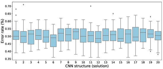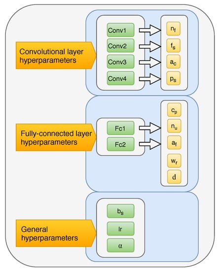 The accuracy of any CNN depends on its structure, which in turn depends on the values of variables known as hyperparameters [26]. Some of the hyperparameters include the number of convolutional and fully-connected (dense) layers, the number of kernels and kernel size of each convolutional layer, weight regularization in the dense layers, the batch size, the learning rate, the dropout rate, the activation function, etc. With the goal of establishing satisfying classification accuracy for each particular problem instance, a CNN with specific structure (design) should be found. The universal rule for finding the optimal network structure for a given problem does not exist, and the only way to create a CNN that will perform satisfactorily for a specific task is by utilizing the “trial and error” approach. Unfortunately, with each trial, the generated network should be trained and tested, and these processes are very time consuming and resource intensive.
