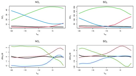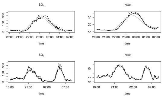 The prediction errors are shown in Table 1, where the best results (minimum RMSE) are marked in bold. As can be seen, they correspond to model  for NO and model  for SO. In both cases, these models incorporate the derivatives of the original functions. Accordingly, we conclude that the derivatives contribute positively to improve the results, which reinforces the role of the functional approach. However, there is an asymmetry between both pollutants: using the concentrations of SO and their derivatives improves the results for NO, but using the concentrations of NO and their derivatives is not an advantage in the estimation of SO. When SO and NO concentrations of both episodes are plotted against time (Figure 4), a slight advance can be seen on the first pollutant compared to the second, which would explain this asymmetry.