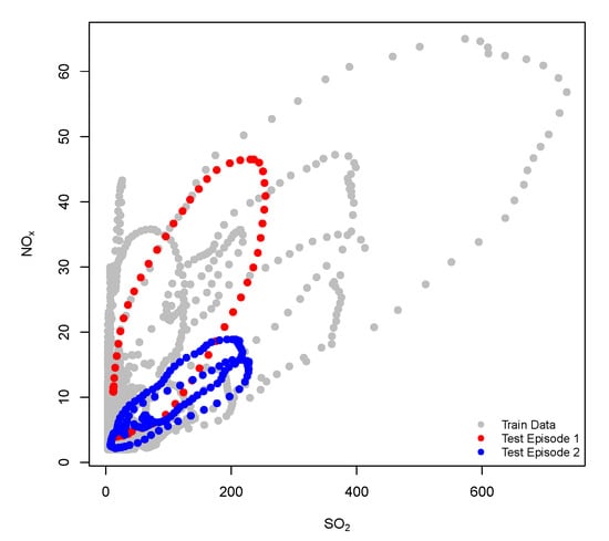 The mathematical model exposed in the previous section was applied to the forecasting of pollution episodes registered at a coal-fired power station located in the northwest of Spain.  and  are two of the main air pollutants generated by combustion processes, and both have harmful effects on human health. Moreover, it was proven that both pollutants are correlated [], which is consistent with the model in (1). Fortunately, pollution episodes are not very frequent and the trend is that they will become scarcer as technology advances.