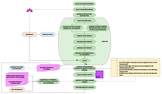 The fuzzy analytic hierarchy process (FAHP) was used for this purpose. Given that there are few tools in the field of multicriteria decision making that work with fuzzy calculus, a new software was created in NI Labview that could process the methodology to be applied through a user interface that allows data to be gathered quickly, easily, and intuitively. It also offers an action plan with the measures to be taken depending on the obtained results. To this end, an innovative methodology was produced that consisted of a modification of the traditional top–down technique that allows for the boundaries between the levels of priority of healthcare device renewal to be identified. Once the data are obtained, there is a sensitivity analysis—also based on a program created in NI Labview—with the aim of proving the robustness of the model. The program also includes a model designed for this study using the AHP in order to contrast the solutions provided by both methodologies.