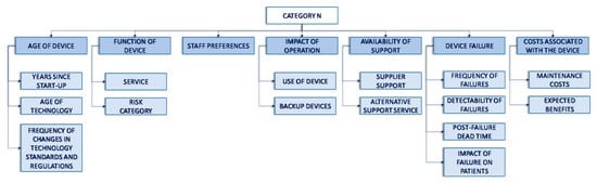 The first level of the hierarchy structure is made up of four scenarios, each associated with the defined categories of medical devices [107] that encompass different medical equipment. This approach allows each type of medical equipment to be treated separately in order to later form part of a joint solution. In addition to favoring the simplicity of the model, the distinction between equipment based on different technologies is considered necessary for the correct subjective evaluation by a decision maker. Therefore, the hierarchical model applied to four different product categories, whose objective is to obtain the renewal priorities of the equipment in each category, is presented. The four equipment categories are as follows: