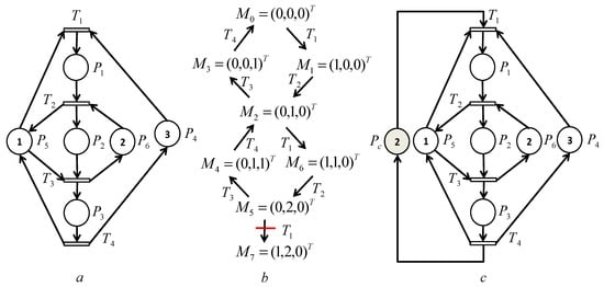 Theory of regions’ example. (a) PN model, (b) the reachability graph, (c) The controlled PN model.