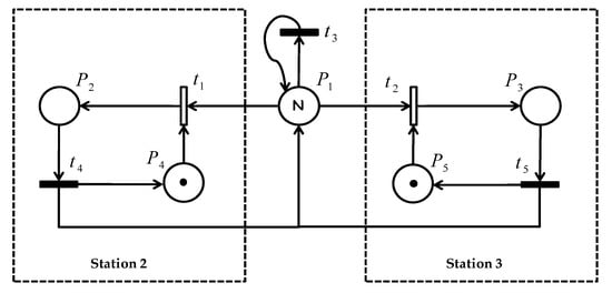 where is the algebraic sum of occurrences of in . Considerably, many MTSI conditions may obtain the same solutions by resolving the linear system composed of Equations (15)–(17). Afterwards, the number of Petri net controllers will be much smaller than the set of MTSI conditions. The following example of Figure 2 is an application of the theory of regions for control synthesis.