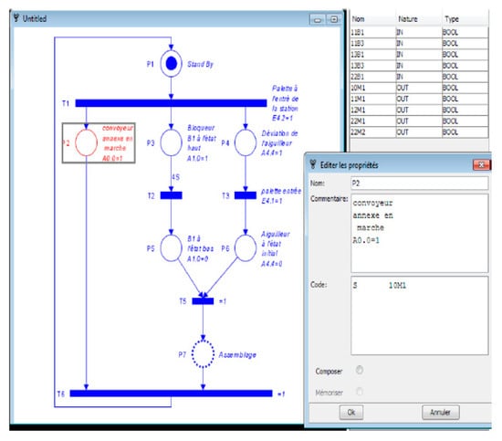 The proposed control policy was implemented in the FMS through a JAVA application (Figure 6), (Rezig et al. 2018) [], wherein the controlled PN model was edited and then transformed into a comprehensible code supported by the Programmable Logic Controller (PLC). Once the internal input/output signals of the PLC are detected, one can transform the PN model into a language supported by the PLC. The LIST language of IEC norm 61131-3 was chosen.