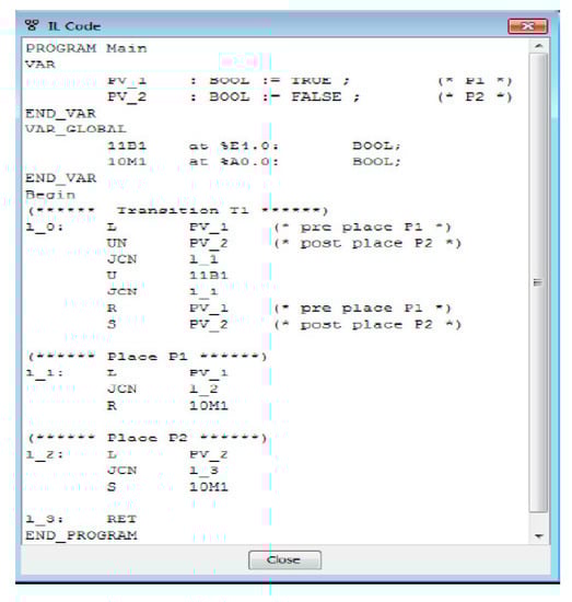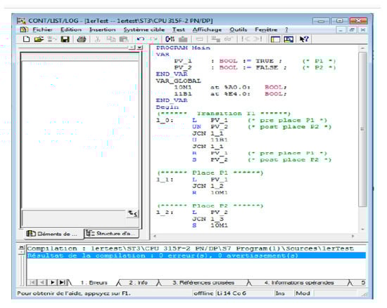 In fact, the JAVA application was developed to model any PN controller and then generate the corresponding LIST code that will be sent to the target in a second time. The interface is functional from the creation of the project until the code generation. It is possible to save a project, to model the controlled PN as in any editor, and to associate the inputs to their addresses in the PLC. Then, the generated code (Figure 7) will be tested using the SIEMENS STEP7 compiler (Figure 8).