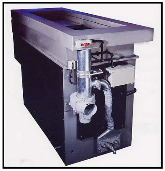 - Degreasing in the vapor phase: Degreasing in the vapor phase is carried out in a tank built of stainless steel (see Figure 2). The pipes to be degreased are fastened in special frames made of corrosion resistant materials and are slowly introduced into the interior of the tank. These pieces must be free of water and moisture prior to degreasing. The immersion time is 10 min, which is sufficient time for the pieces to reach the temperature of the steam. It can be verified that this temperature has been reached because the steam does not condense on the lower surfaces of the pieces.