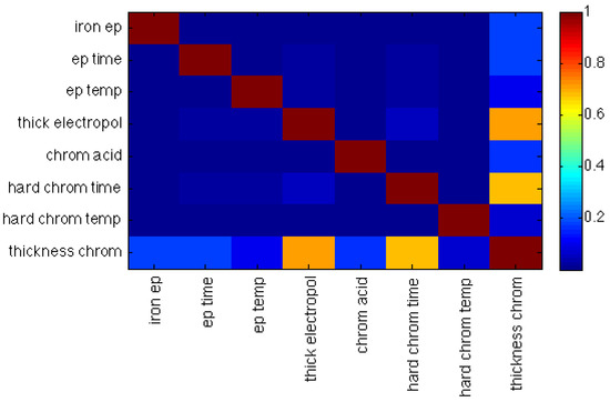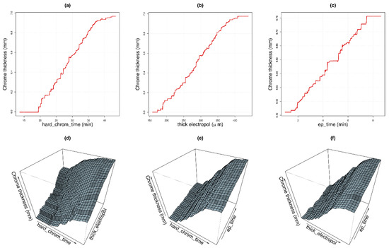 Figure 6d shows the variation of the thickness of the hard chrome layer as a function of hard chromium process time and the thickness of the layer removed by electropolishing, holding the remaining input variables constant. Here, it can be observed that the relative importance of the first two independent variables in the process is similar, as the chrome thickness grows at a similar rate with these two variables. Figure 6e,f show that electropolishing time has less influence over the process than the two previous independent variables, as chrome thickness remains relatively constant when this variable increases compared with the increment when the two other variables increase. This is consistent with the results shown in Figure 7, which show the relative importance of the variables within the model. The first two variables have similar importance while the third variable is less relevant.