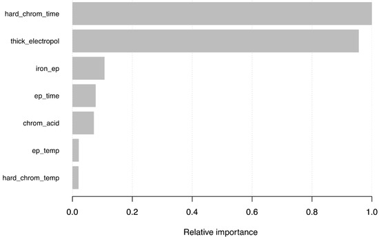 The most meaningful criterion is Frequency; therefore, it was utilized to contruct the chart of the relative relevance of the variables. According to the previous methodology, hard chromium process time is the most influential variable in the thickness of hard chromium layer prediction. This is consistent with the actual process, where the processing time is the main parameter of the operation. It is followed by the input variable layer thickness removed by electropolishing. Moreover, both the iron content of the electropolishing bath and electropolishing time are the third and fourth most influential variables in the thickness of hard chromium layer prediction, respectively. The fifth position in the influence ranking is held by the chromic acid content and the final positions are taken by electropolishing bath temperature and hard chrome bath temperature (see Table 4 and Figure 7).